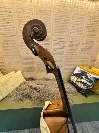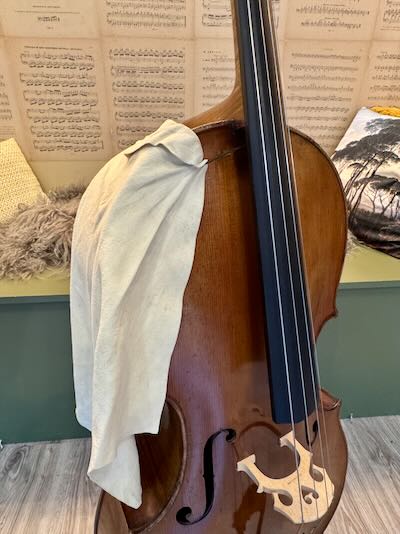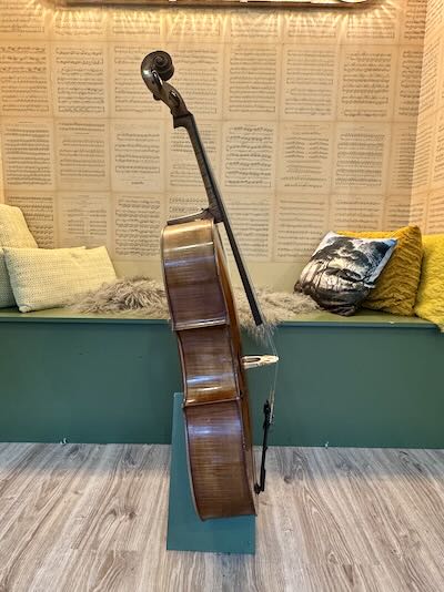 Op de cello zit het fantastische Frirsz staartstuk a € 434,00 dat overal uitverkocht is. Er zit ook een gloednieuwe punt in de prijs inbegrepen. Ook een ‘cocon’, een half harde cellohoes met rugbanden krijg je hierbij, en een super strijkstok van Chinese makelij somma € 575,00.